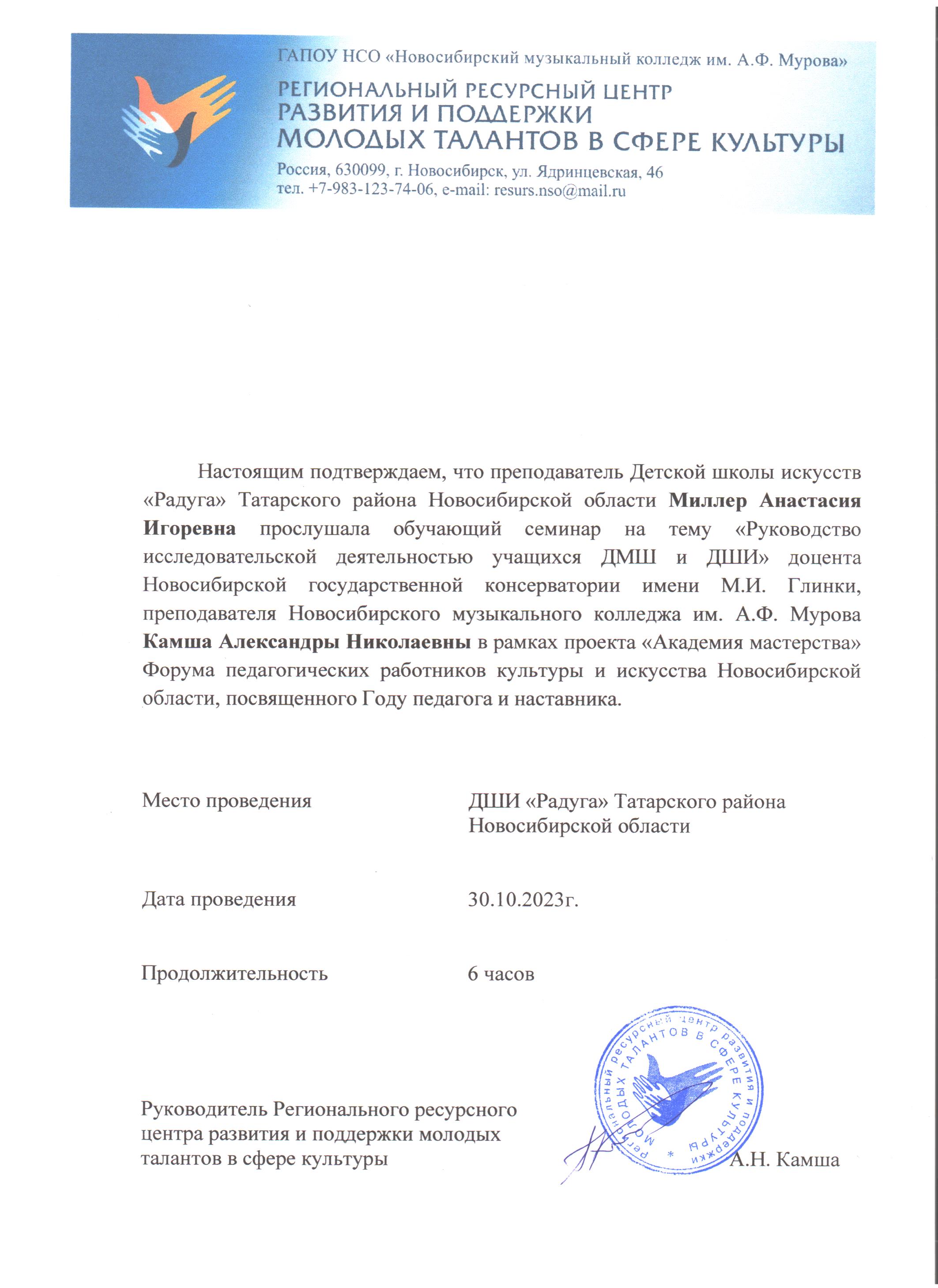 Сертификат слушателя семинара "Руководство исследовательской деятельностью учащихся ДМШ и ДШИ", 2023г., 6 часов