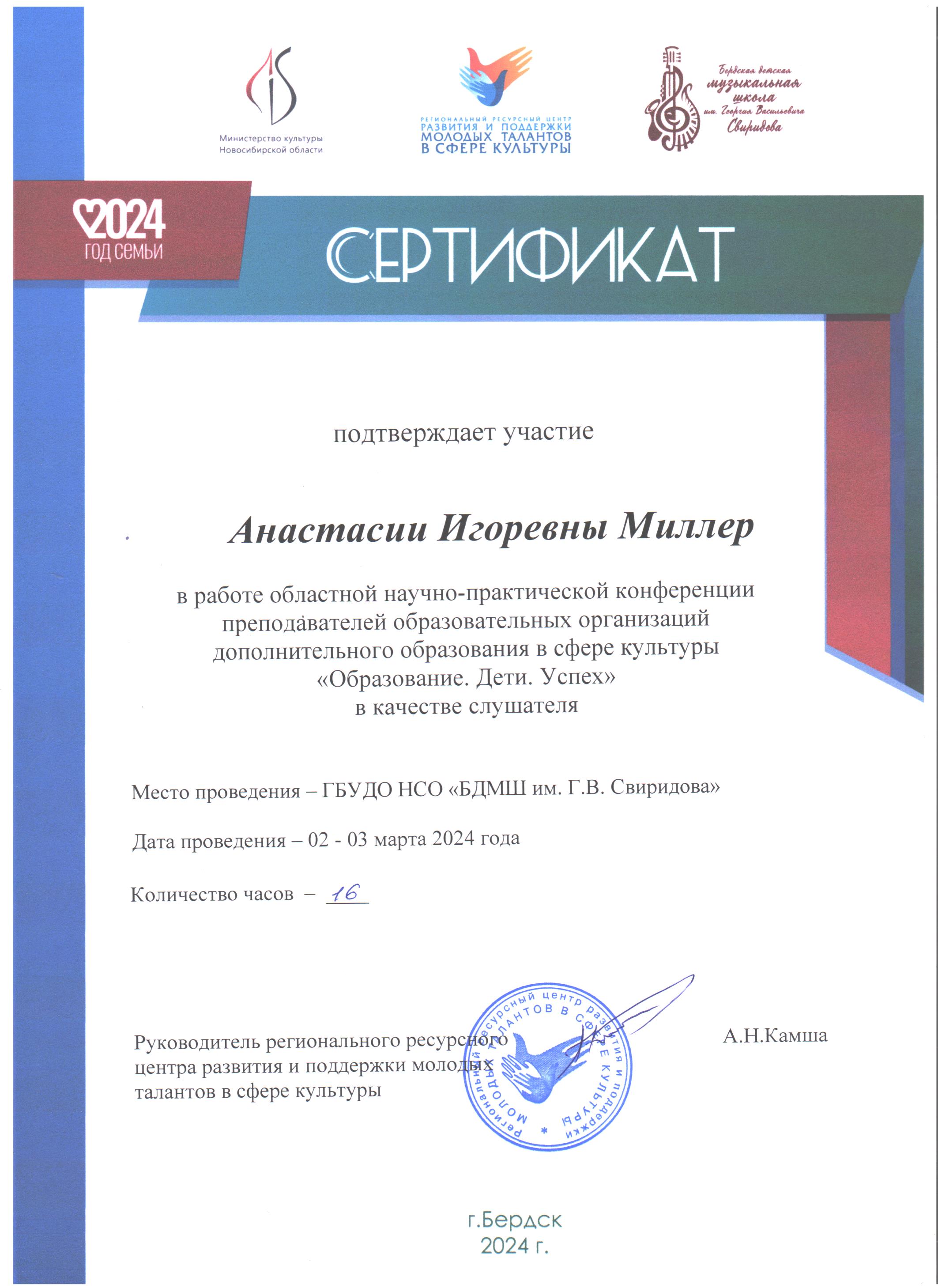 Сертификат участника областной научно-практической конференции преподавателей образовательных организаций дополнительного образования в сфере культуры "Образование. Дети. Успех", 2024г., 16 часов