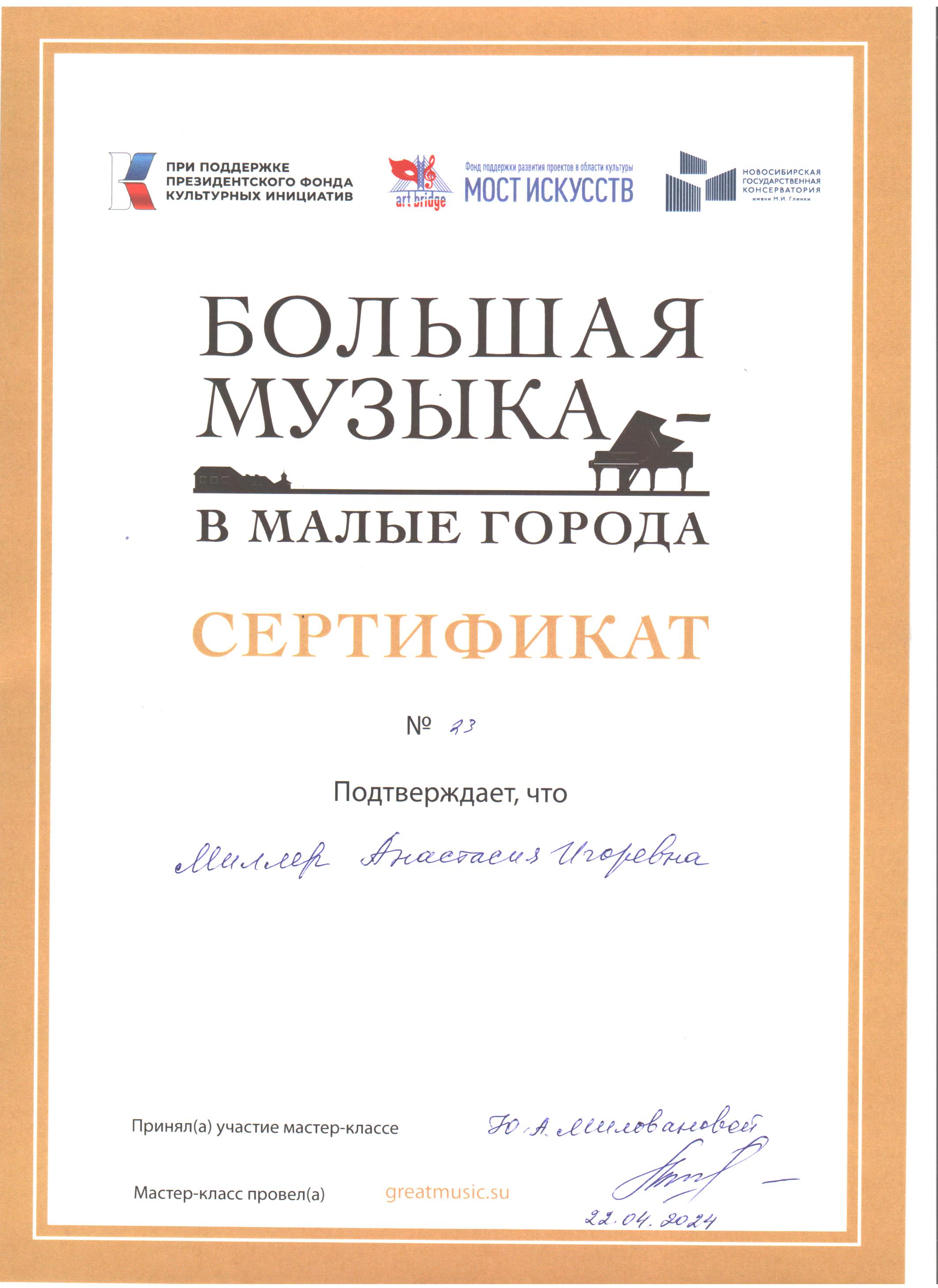 Сертификат участника мастер-класса, в рамках реализации проекта "Большая музыка в малые города" 2024г.