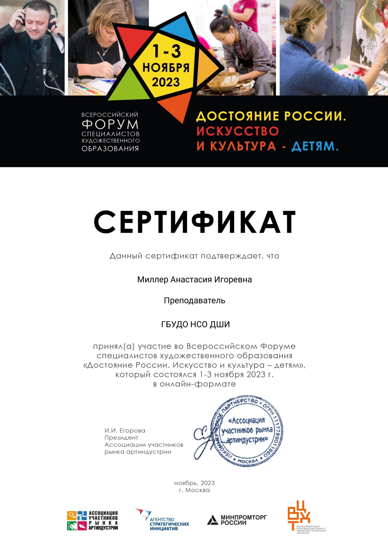 Сертификат участника Всероссийского форума специалистов художественного образования "Достояние России. Искусство и культура детям", 2023г.